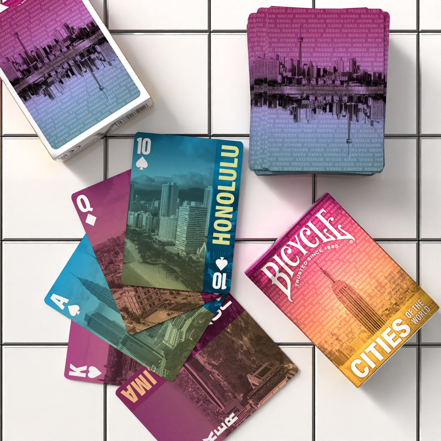 Dieses Produkt wird am 24. Oktober 2025 veröffentlicht. Vorbestellungen sind bereits möglich, und werden ab dem Veröffentlichungsdatum ausgeliefert.Tragt die Welt in eurer Tasche mit den Bicycle® Cities of the World (Städte der Welt)-Spielkarten! Jede Karte zeigt die Skyline einer anderen Stadt von überall auf der Welt. 52 Karten – 52 Ziele! Wunderschöne, moderne Karten in einer folierten Verpackung – eure nächste Kartenhand könnte Inspiration für die Reise eures Lebens sein!